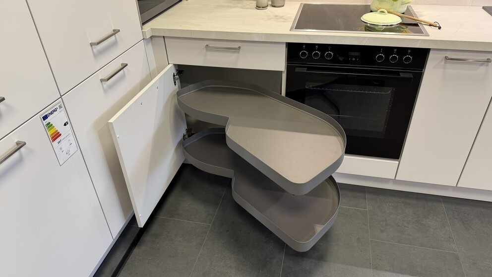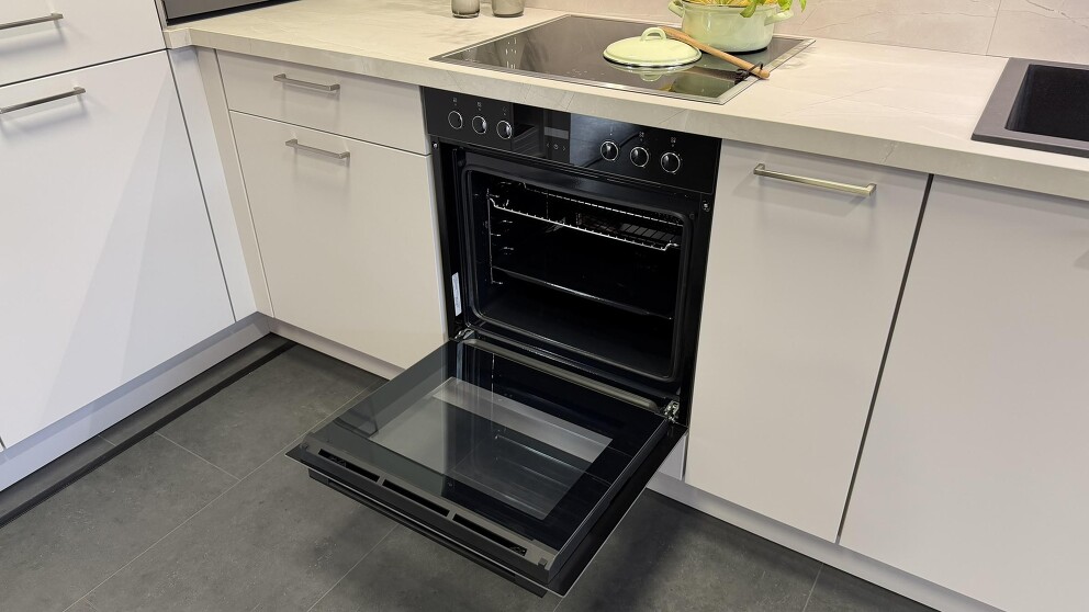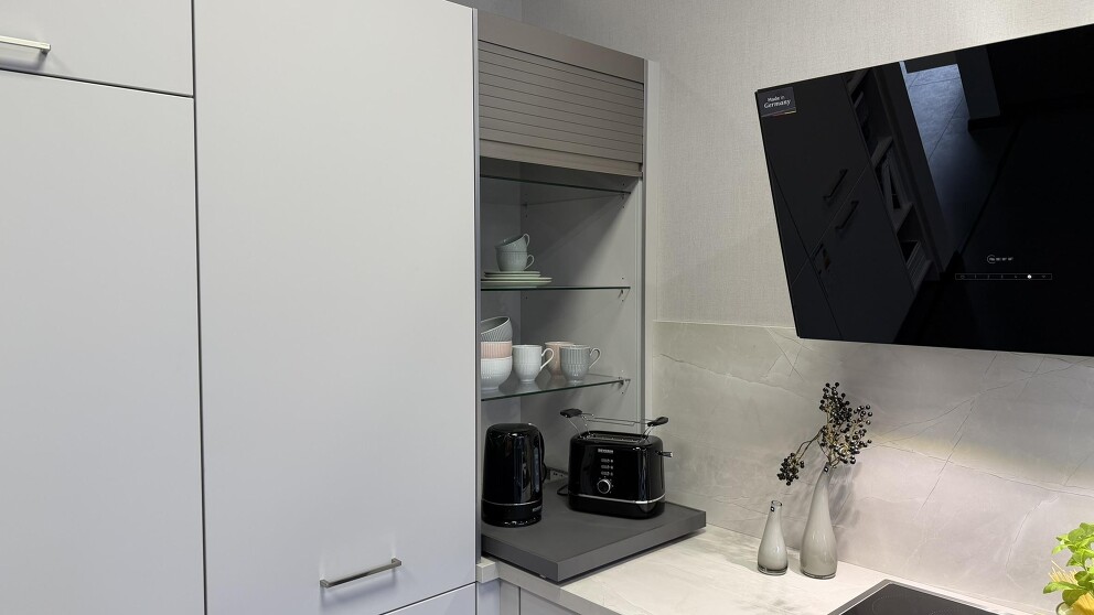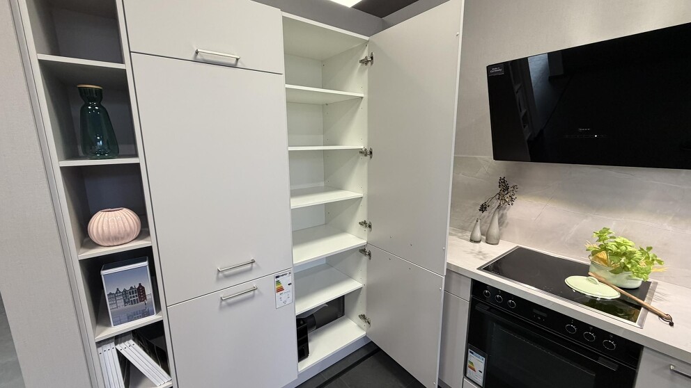 Ausstellungsküche Nobilia L-Form Seidengrau Lack inkl NEFF Geräte